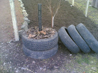 - Spuds (only 4) in tyres ... yes tyres! An experiment. They're well worn so all Cadmium should have oxidised, but just in case, they're lined too. I'm going to use a similar method to that used with the Henley Potato Towers to save a long explanation. If this works I may make towers for next year, I think shipping the Henley one's to Bulgaria would be impractical .... unless someone knows different(?????). Why all this trouble ... two words ... WEEDS & COLORADO!! A further experiment is to grow the remaining main crop seed potatoes in .... wait for it ........ grain bags!!!! I think I'm going to track this method in a separate post.